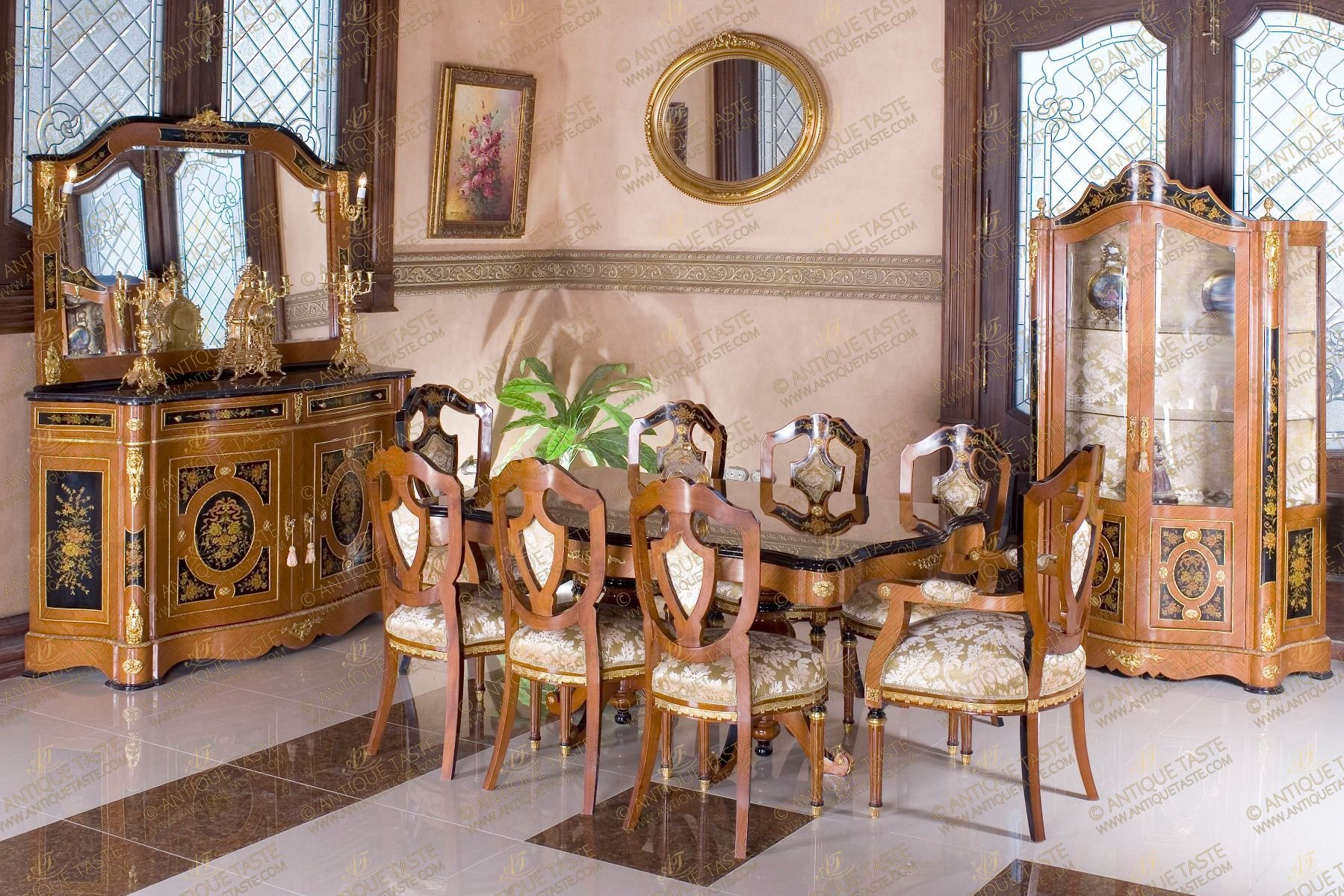 A dignified Napoleon III Louis XVI Revival style eleven pieces Dining Room after the model Circa 1865; splendidly ormolu-mounted, ebonized, sans-traverse rosewood veneer and floral bouquet marquetry inlaid; ornamented with different shapes of rosettes, square rosettes, oval rosettes and circular rosettes, scrolling acanthus pierced works, acanthus chutes, ormolu bands with a draped fabric and tassel design and ormolu acorn finials; the fine set is comprising of a pedestal dining table, six dining chairs, pair of armchairs, buffet with mirror and display cabinet.