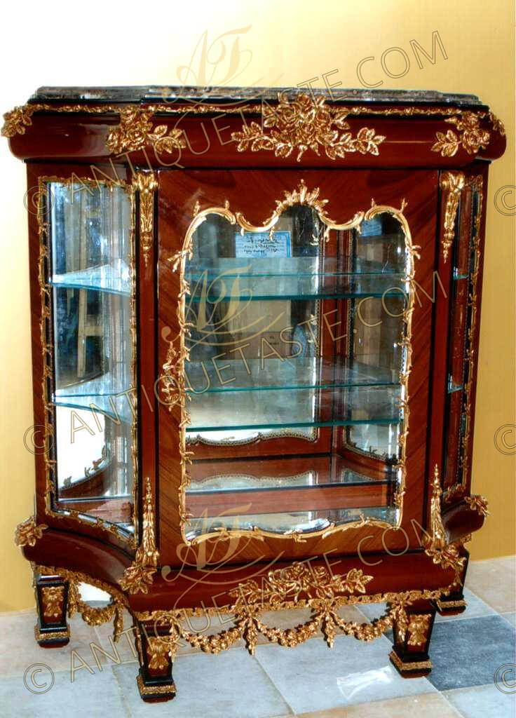 The legs and the frieze are ornamented with ormolu pendant swags and connected with curvy X stretcher garnished with flower garlands. The underneath sides and center are adorned with ormolu urn of prosperity.